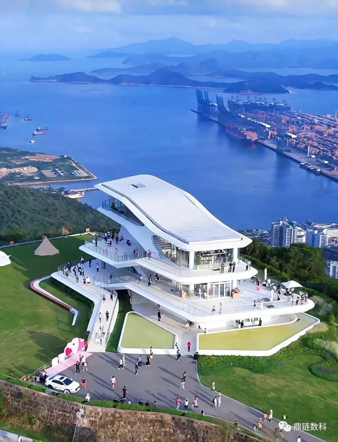 纯白色镂空甲板造型的观景台,共有三层楼,顶层是咖啡厅+图书馆,点杯咖啡坐在落地窗边,听听音乐看看书,还能欣赏盐田港的海景,真的不要太惬意!