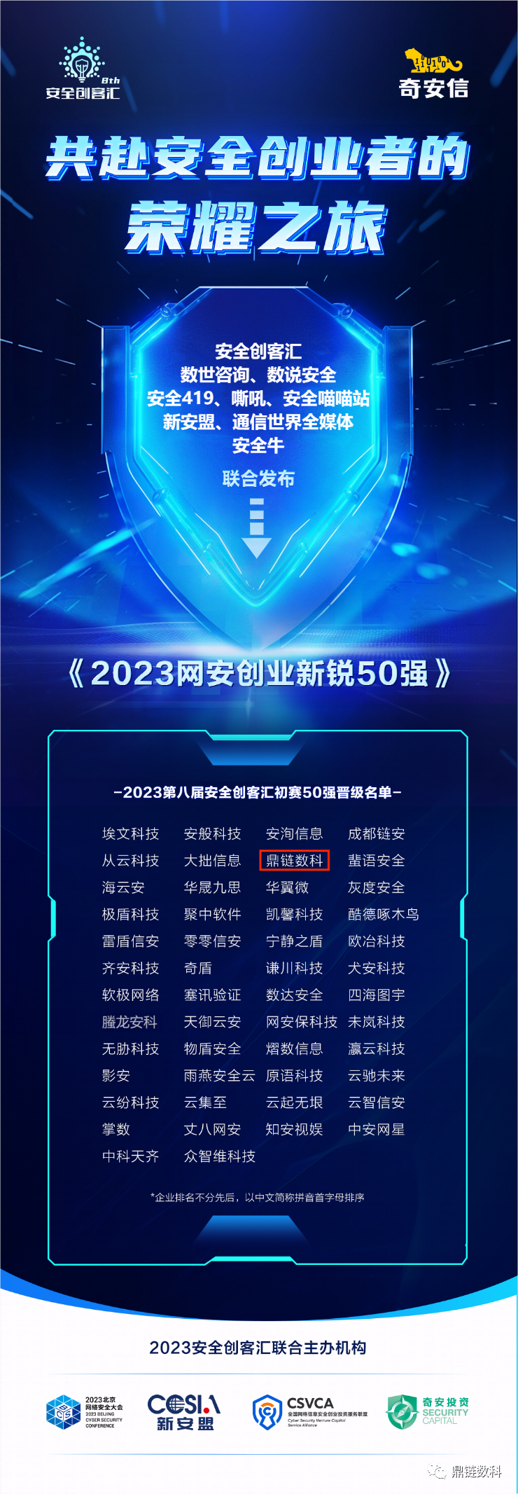 鼎链数科作为区块链与密码方向的泛安全领域代表性企业,顺利入围本届安全创客汇50强。鼎链数科致力于为数字政务、金融、能源、医疗、教育等重点领域提供先进的区块链与密码产品及解决方案,拥有自主代码、自主密码的鼎链联盟区块链平台。鼎链数科参与多项区块链相关国家/行业标准制定,牵头制定《区块链密码使用指南》及《面向区块链的证书服务接口规范》两个密码行业标准,其自主研发的区块链密码节点机为全国首款获得国家密码管理局“区块链密码模块”商用密码产品认证证书的区块链硬件产品。
